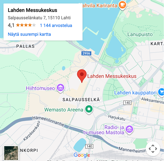 Lahden Urheilu- ja Messukeskus sijaitsee hyvien kulkuyhteyksien varrella, upean luonnon äärellä. Lahden keskusta on lyhyen kävelymatkan päässä.